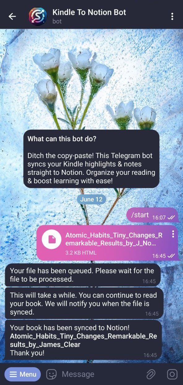 Ditch the copy-paste! This Telegram bot syncs your Kindle highlights & notes straight to Notion. Organize your reading & boost learning with ease!
